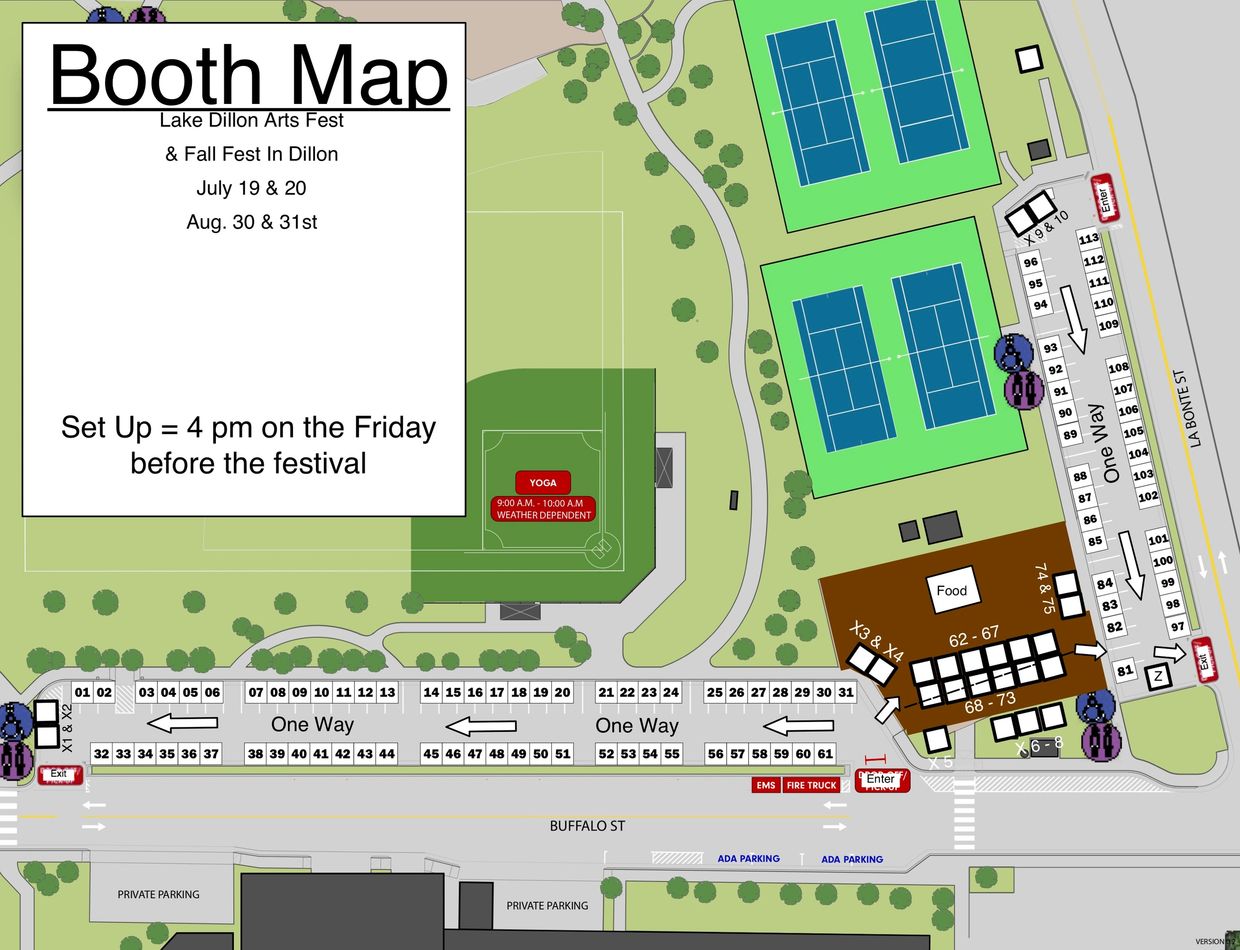 Notice the Entrances & Exits and the One Way on the booth map below. Pull up to your spot, unload, and remove you vehicle. You will have 30 minutes. You may stay as long as you like to set up, but you must remove your vehicle ASAP.